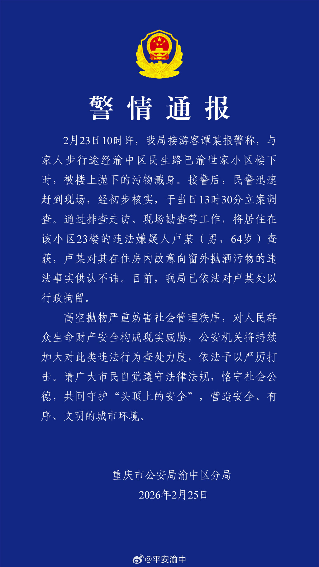 游客被高空抛下污物溅身,重庆渝中区警方通报