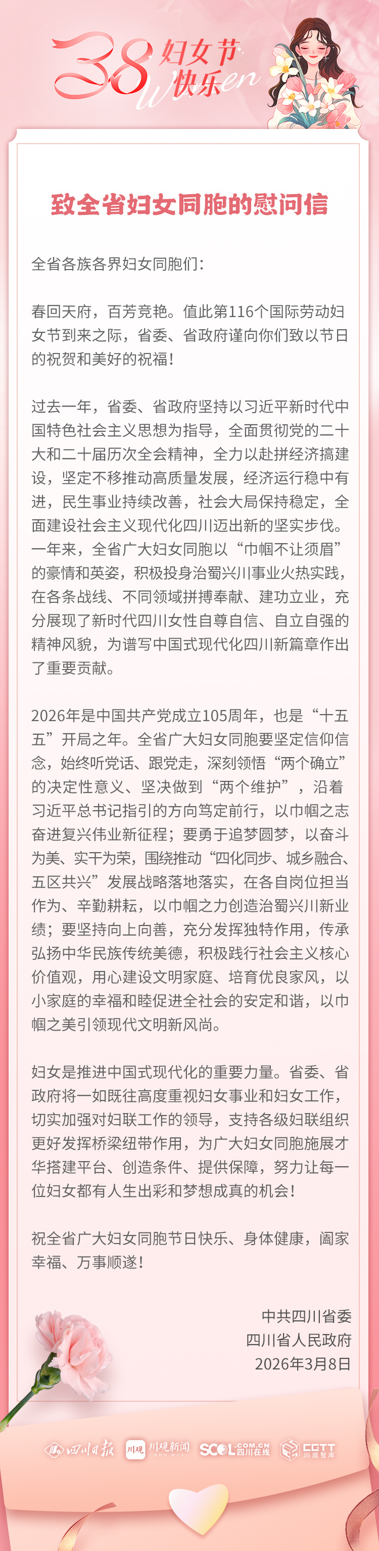 2026年是中国共产党成立105周年,也是“十五五”开局之年。全省广大妇女同胞要坚定信仰信念,始终听党话、跟党走,深刻领悟“两个确立”的决定性意义、坚决做到“两个维护”,沿着习近平总书记指引的方向笃定前行,以巾帼之志奋进复兴伟业新征程;要勇于追梦圆梦,以奋斗为美、实干为荣,围绕推动“四化同步、城乡融合、五区共兴”发展战略落地落实,在各自岗位担当作为、辛勤耕耘,以巾帼之力创造治蜀兴川新业绩;要坚持向上向善,充分发挥独特作用,传承弘扬中华民族传统美德,积极践行社会主义核心价值观,用心建设文明家庭、培育优良家风,以小家庭的幸福和睦促进全社会的安定和谐,以巾帼之美引领现代文明新风尚。