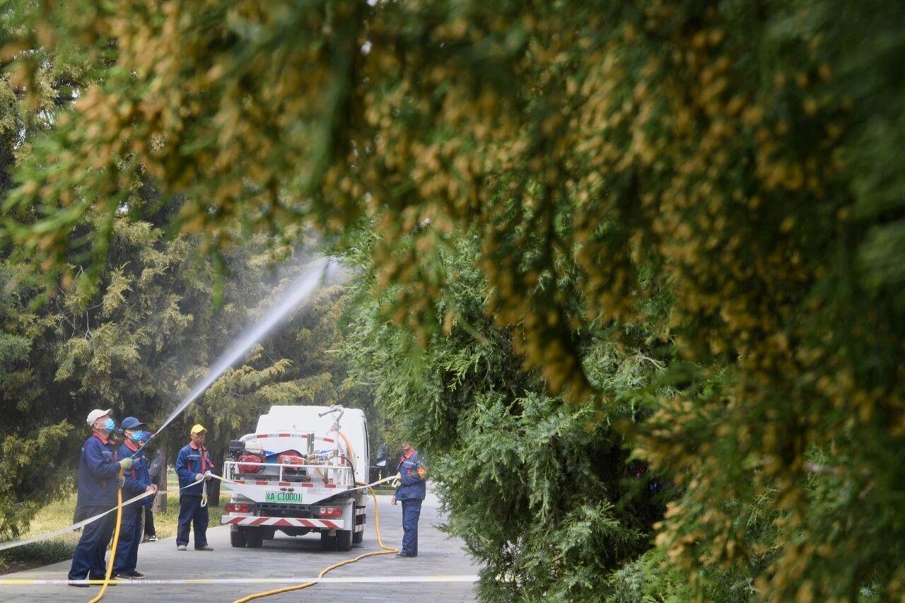 △北京天坛公园的园林工人通过喷水作业降低花粉浓度。(资料图)