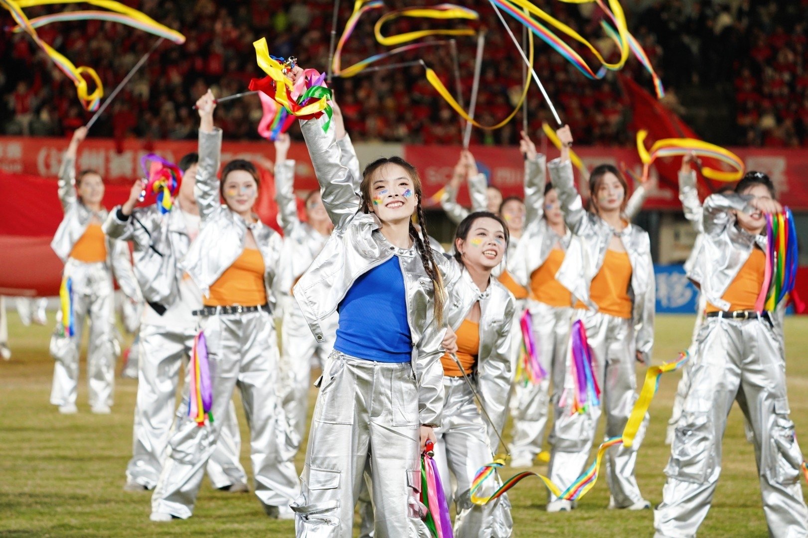 东道主达州带来的《巴风賨韵》以巴人战歌为基底,融合板凳龙舞、发光蹴鞠等元素,串联起古代竞技与现代足球的体育血脉,尽显达州本土文化魅力。