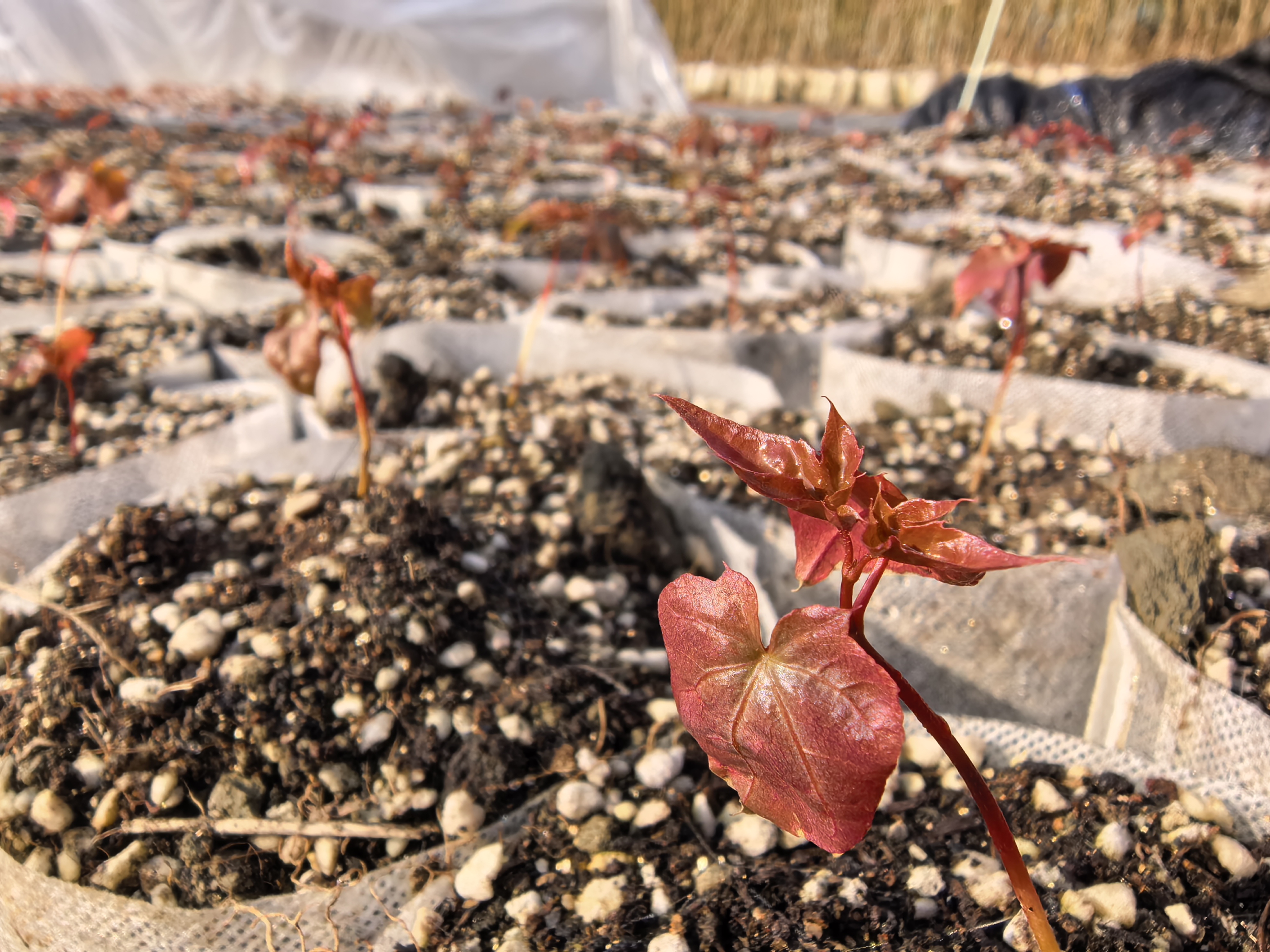 一路之隔的苗区,元宝枫种子直接点播入无纺布育苗杯,从播种到展叶不过一月有余,鲜红嫩叶在阳光下格外悦目。正是这条高效、科学的育苗生产线,为龙泉山的持续增绿提供了源源不断的“弹药”。