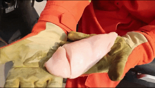 随后,消防员用猪肉和鸡肉模拟人体皮肤,测试风筝线的锋利程度。风筝线划过之后,猪肉和鸡肉上均出现几厘米深的切口。