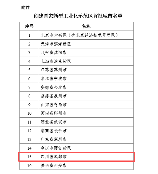 3月16日,工业和信息化部公布创建国家新型工业化示范区首批城市名单共16个。其中,成都成功入选。