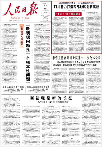 贯彻落实习近平总书记重要指示精神,四川深入实施前沿科技攻坚突破行动,科技创新能力稳步提升,“十四五”时期全省每万人口高价值发明专利拥有量增长2倍多,2025年技术合同成交额突破3000亿元。奋进“十五五”,四川将持续提升创新体系整体效能,增强科技创新策源功能,打造西部地区创新高地。