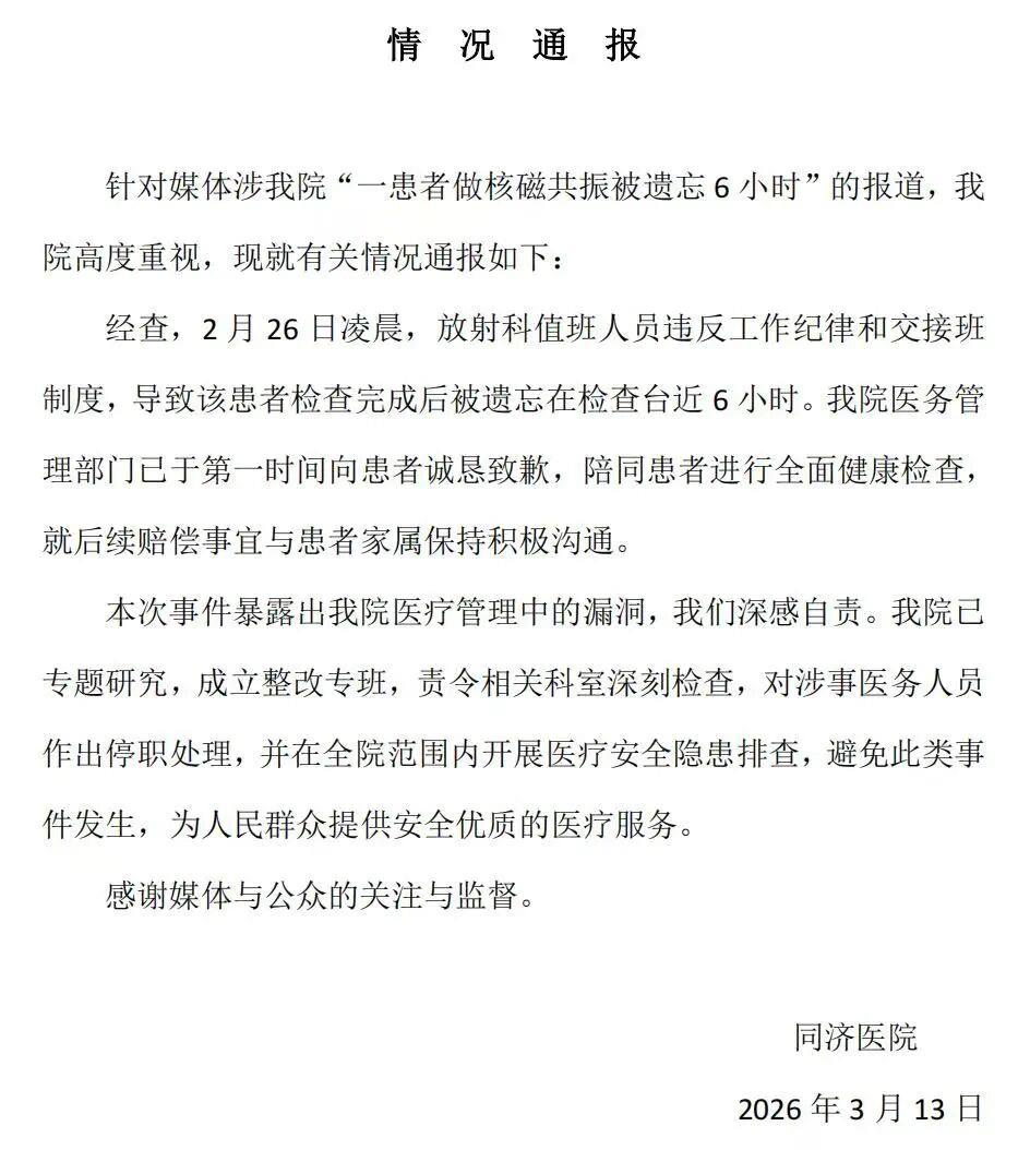 近日,“一患者做核磁被遗忘6小时”一事引发广泛关注,华中科技大学同济医学院附属同济医院针对此事发布了情况通报。