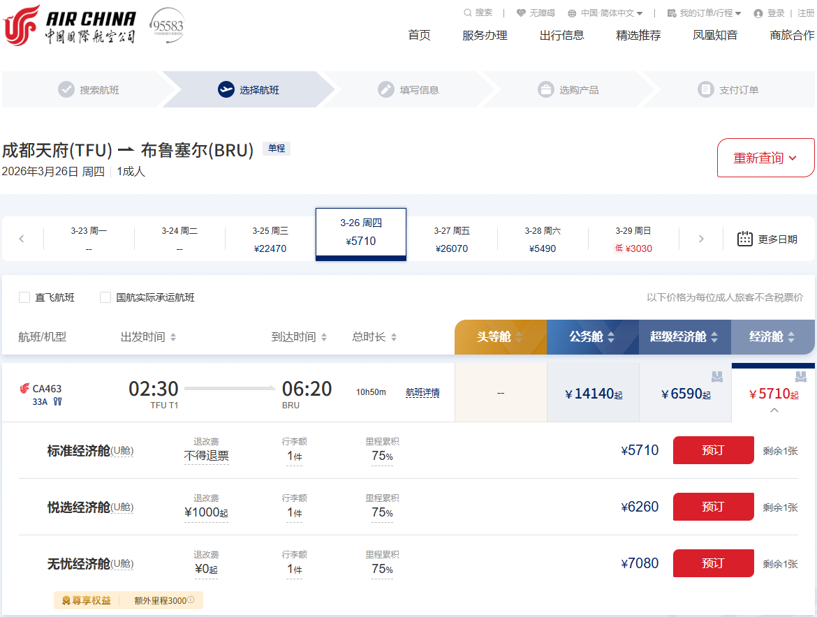 国航3月26日成都直飞布鲁塞尔航班可购票。