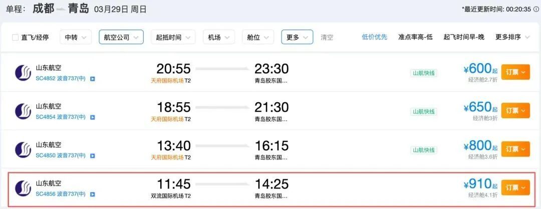 记者通过售票系统查询及向航司、机场求证了解到,3月29日开始,山东航空开通成都双流直飞济南、青岛两条航线,均为每天一班;3月30日开始,春秋航空开通成都双流直飞上海虹桥航线,亦为每天一班。这些航班机票均已上线销售。这两家航司入驻成都双流国际机场运营后,在成都天府国际机场也运营航班。