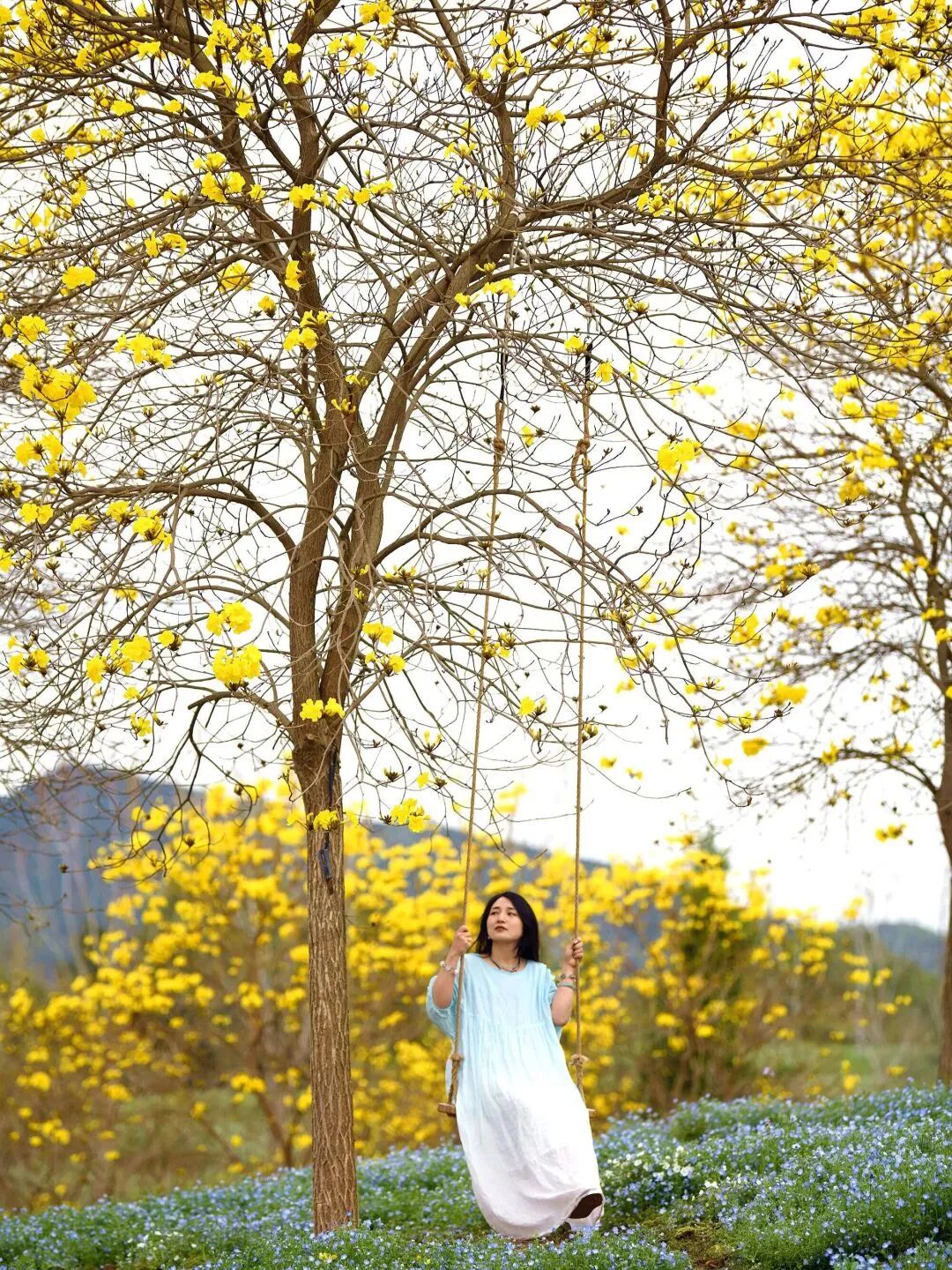 金堂赵家镇金色春谷里,4万余株金黄风铃缀满枝头,400亩花海依山傍水,满目鎏金,宛如童话秘境。