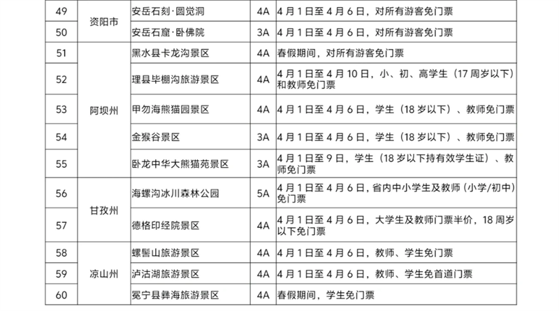 其中,广元全市45家A级景区于4月1日至4月30日(清明节假期除外)面向全国全日制中小学生、幼儿园儿童、在职教师免门票,每名学生(儿童)随行的2名家长(或法定监护人)也可享受门票7折优惠;青城山-都江堰、海螺沟冰川森林公园等景区针对中小学生等特定群体实施免门票政策;瓦屋山景区、安岳石刻·圆觉洞、天府芙蓉园、黑水县卡龙沟等景区面向所有游客免门票。除100多家景区免门票以外,达古冰川、丹景台等部分景区也推出不同的门票优惠政策。