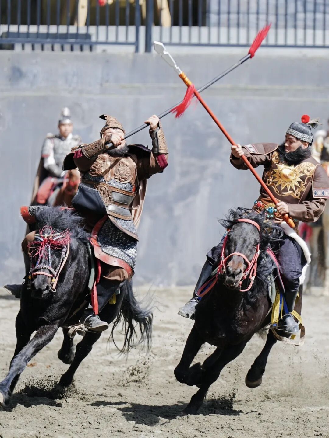在6000平方米真实沙场上,村庄、城楼、军营等场景高度还原,80余位专业演员携数十匹骏马,以马背站立、马上骑射等高难度马术特技,配合炮火、狼烟、水爆等史诗级特效,实现水陆空三栖联动,尽显蜀地英雄气概。