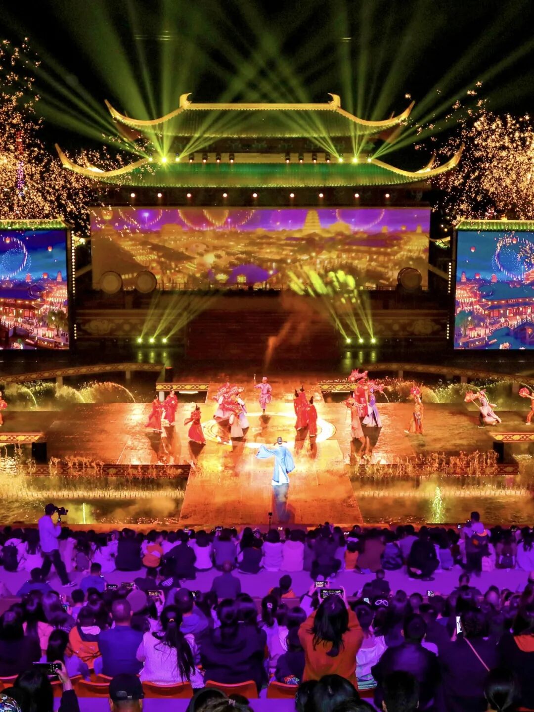 占地2万平方米的实景剧场以国风长廊、银丝古建、湖面水景、升降舞台、高空威亚等构建恢宏演出空间,裸眼3D水幕、激光喷泉、飞天特技、非遗铁花等特效接连炸场,观众席还配备雾泡、飘雪、花瓣雨等沉浸式特效装置。