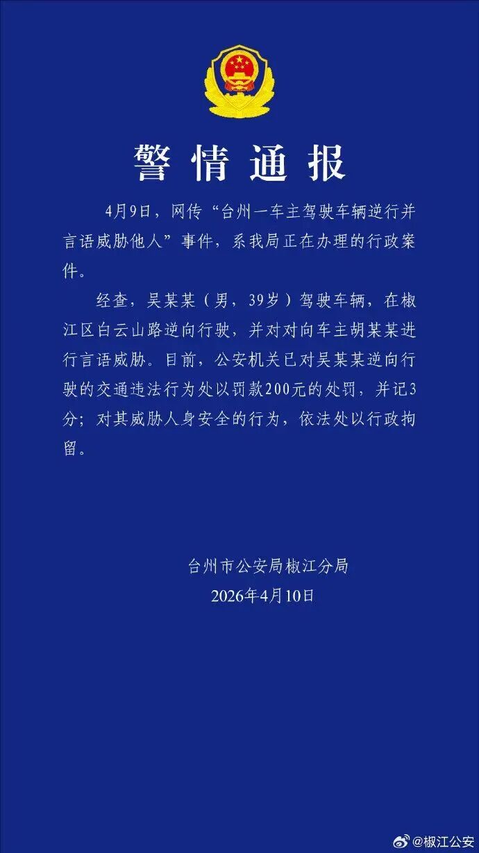 4月9日,网传“台州一车主驾驶车辆逆行并言语威胁他人”事件,系我局正在办理的行政案件。
