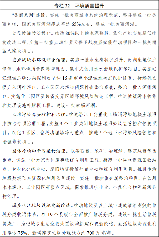 持续改善空气质量,着力降低细颗粒物(PM2.5)浓度,推动氮氧化物和挥发性有机物协同减排。推进工业源、移动源、城乡面源等综合整治,推动重点行业超低排放改造和深度治理,加强挥发性有机物源头替代和全流程治理。强化重点区域、重点时段大气污染防治,精准、科学应对重污染天气,深化区域联防联控。实施美丽蓝天、蓝天赋能等治理项目。全面推进江河湖库保护治理,统筹水资源、水环境、水生态治理,构建重点流域上下游贯通一体的生态治理体系。深化河湖长制工作,推动建设美丽河湖、幸福河湖。深化重点小流域达标攻坚和小微水体治理保护,基本完成入河排污口排查整治,强化城乡生活污水收集处理。深入推进饮用水水源地保护,强化地下水污染源头管控。加强土壤污染源头防控,开展四川省第二次全国土壤污染状况普查,分期分批推进农用地土壤重金属溯源和整治,促进建设用地安全利用。加强噪声污染治理。