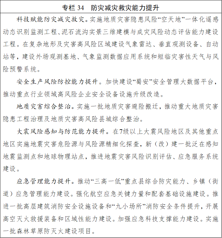 深化科技赋能防灾减灾救灾“揭榜挂帅”机制,推动关键核心技术攻关和成果转化应用。常态化更新灾害风险普查数据,深入推进灾害风险普查成果应用。加强地震、地质灾害、气象、水文等预警预报,构建“空天地”立体监测预警体系,完善预警响应联动机制。开展森林草原防灭火常态化治理,开展重点流域防洪,推动地质灾害隐患防治,支持地质灾害高风险县城综合整治。加强应急抢险救灾装备配备及物资储备,实施应急避难场所提升改造,加强综合性常备骨干力量以及航空、高原高寒、轨道交通、桥梁隧洞、深水打捞等专业救援力量建设。提升房屋和基础设施地震灾害风险感知与防范能力,增强公众地震避险意识和能力。