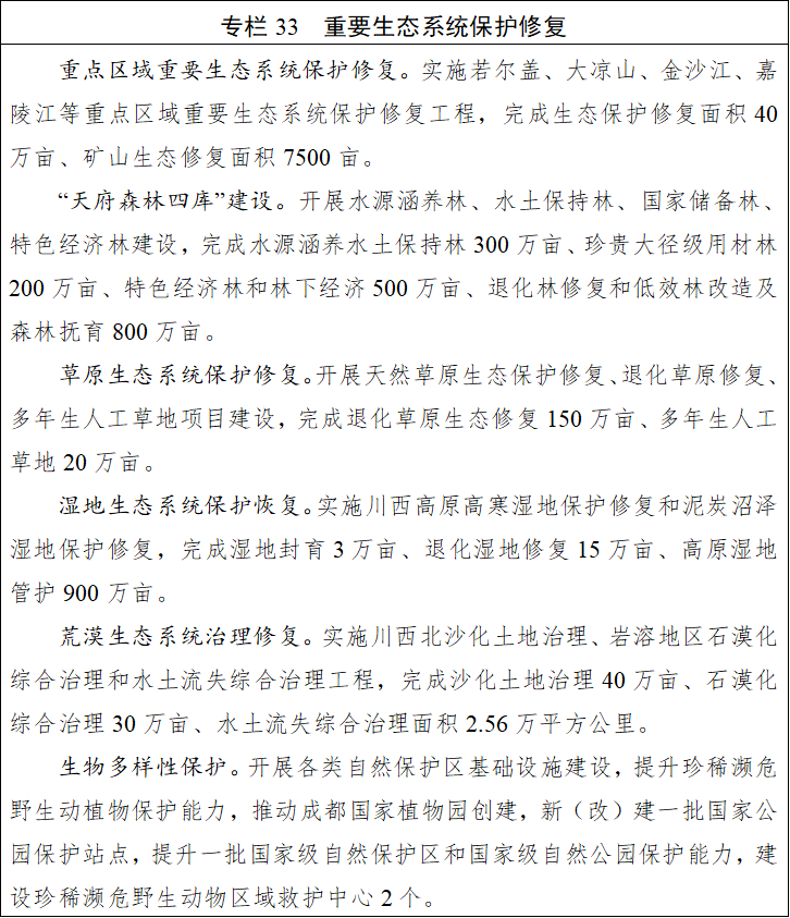 聚焦“六江”生态廊道、横断山区、安宁河等重点区域,谋划实施山水林田湖草沙一体化保护和修复工程。加强森林、草原、湿地、河湖等重要生态系统保护修复,推行草原森林河流湖泊湿地休养生息。以山系和流域为治理单元,统筹推进长江重点生态区(含川滇生态屏障)、青藏高原生态屏障区等重点区域生态保护修复。开展生态保护修复成效评估,推进长江、黄河防护林体系和沿江绿色生态廊道建设。强化沙化、石漠化、荒漠化土地和废弃矿山、水土流失综合治理,加强有害生物防治。推进森林可持续经营,精准提升森林质量,加强翠云廊古柏群、云峰山古桢楠群等古树名木保护。