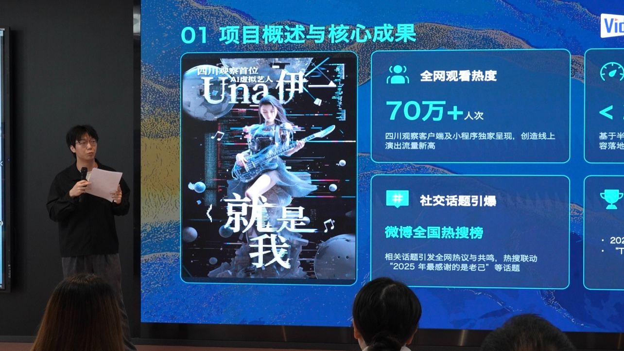 四川观察都皓则揭秘全国首场AI虚拟艺人“Una伊一”线上演唱会的幕后故事。这场演唱会综合运用AIGC音乐生成、AI动画、动态捕捉、XR虚拟拍摄等多项前沿技术。都皓透露,演唱会的核心挑战在于实现多场景下虚拟形象的“高度统一”与“自然交互”。团队仅用不足两个月周期完成全部制作,体现了AIGC时代“快速迭代、实时调整”的新流程。最终,演唱会累计在线观看人数超70万人次。同时,“2025年最感谢的是老己”等演唱会相关话题登上了微博全国热搜榜。