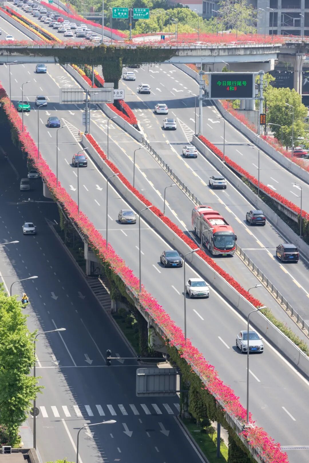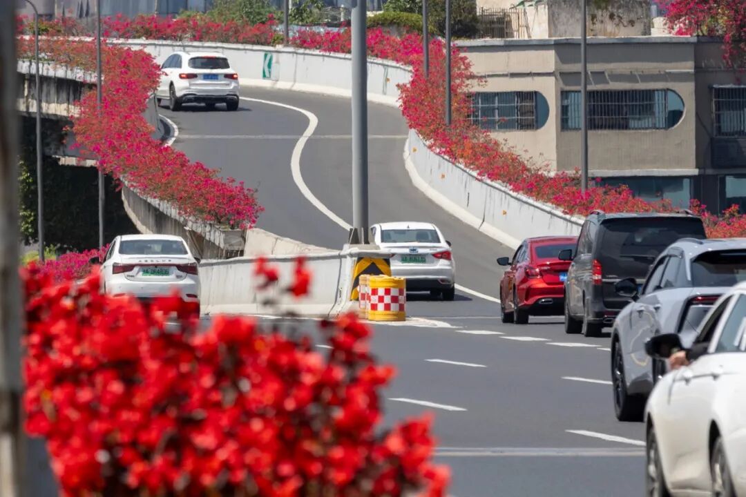 二环高架两侧的花卉次第绽放,粉艳的月季、紫韵的三角梅相互映衬,层层叠叠缀满护栏。