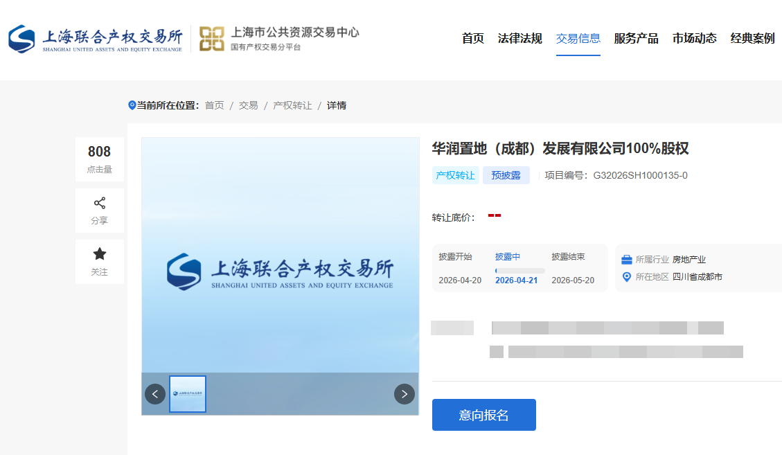 4月21日,记者从上海联合产权交易所获悉,华润置地有限公司旗下全资子公司超智资源有限公司于4月20日起预披露,转让其所持有的华润置地(成都)发展有限公司100%股权。华润置地(成都)发展有限公司正是成都万象城的实际主体公司。此次股权转让事宜已于今年4月初获得华润置地有限公司批准。
