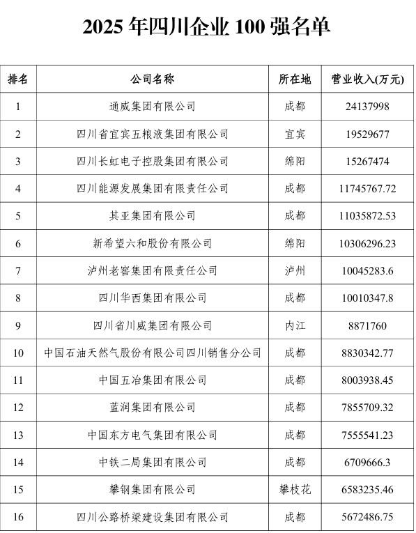 2025年四川企业100强由四川省企业联合会、四川省企业家协会连续第22年发布,会上还发布了《2025年四川企业100强整体分析报告》(以下简称《报告》),《报告》沿用了“中国企业500强分析报告”的指标体系,涵盖了不同行业、不同所有制的企业,着重对申报企业2023年度与2024年度的营业(销售)收入、利润、资产、研究开发费用、从业人数等指标进行对比分析。
