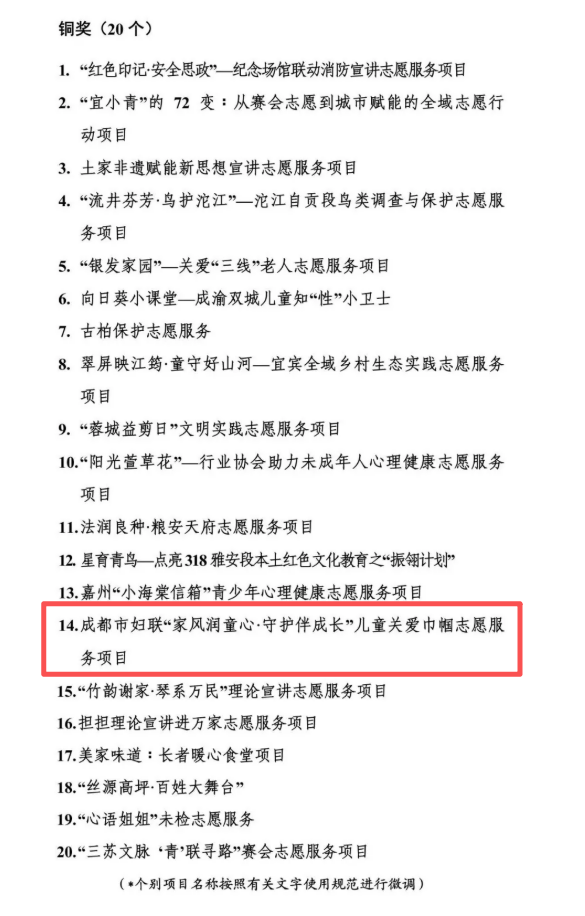 经过激烈角逐,成都市妇联“家风润童心·守护伴成长”儿童关爱巾帼志愿服务项目,荣获四川省首届志愿服务项目大赛铜奖。
