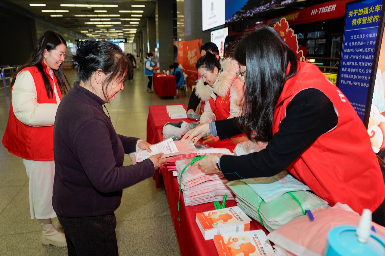 “阿姨,这是妇女‘两癌’防治手册,路上可以看一看。”“小朋友,这个福字送给你,出行记得做好防护。”巾帼志愿者们化身“多面手”,暖心服务中将红红火火的新年福字、热气腾腾的健康中药饮、实用能装的环保袋递到旅客手中。同时,为了让归家的新春更有“家”的气息,还发放了围裙、碗具等厨具用品和《家风育廉一一蓉城家风宣传资料汇编》等书籍。