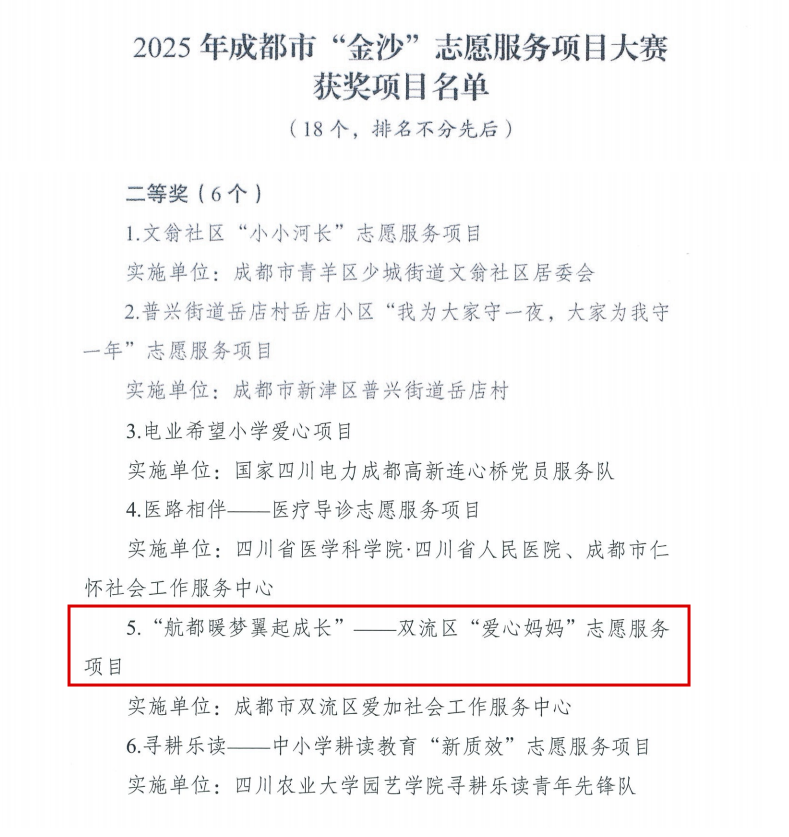 其中,由成都市双流区爱加社会工作服务中心实施的“航都暖梦 翼起成长”——双流区“爱心妈妈”志愿服务项目荣获二等奖。