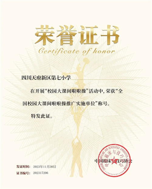 本次比赛共有来自全国各地219支队伍,共计4000余名运动员参加。经过四天的激烈角逐,四川天府新区第七小学啦啦操代表队在本次比赛当中获得俱乐部儿童混合组大集体爵士自选动作“季军”,学校获“全国校园大课间啦啦操推广实施单位”授牌,田美琳老师获“优秀教练员”“全国校园大课间啦啦操推广先进个人”称号。
