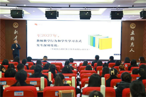 成都七中育才学校教育集团党委书记吴明平作题为《转变学习方式,把学生解放出来》的分享。他结合当今学生最流行的学习方式和学习的现状,聚焦《基础教育课程教学改革深化行动方案》,阐述了教师教学行为和学习方式发生深刻变化的重要性。