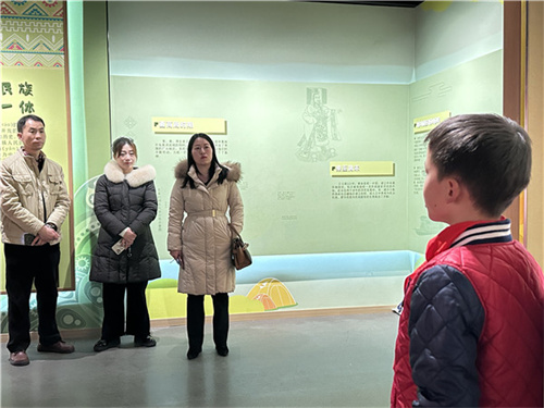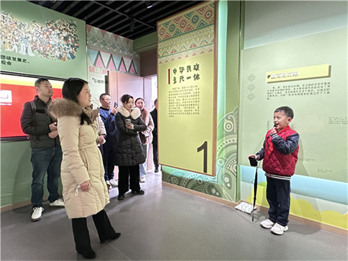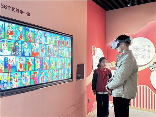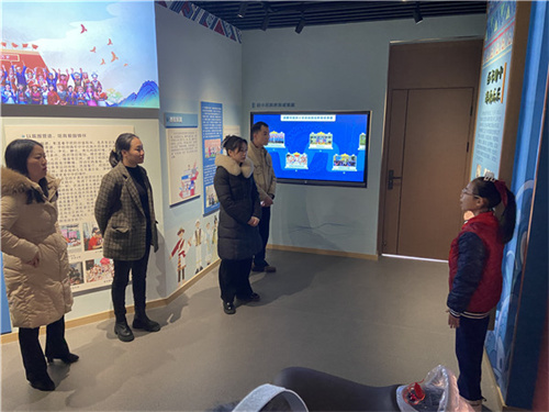 在红领巾讲解员的讲解下,来访嘉宾参观了回民小学铸牢中华民族共同体意识主题教育基地——“爱我中华”民族魂教育展陈馆。通过亲身体验VR实景漫游、民族服饰换装、民族体育等项目,感受了该校因校制宜,借助信息化手段,创新民族团结进步教育的举措。