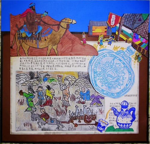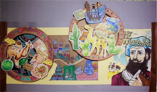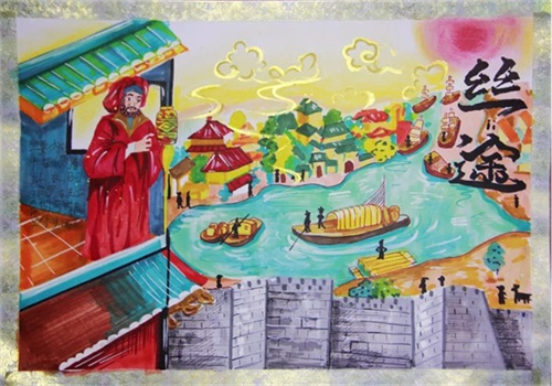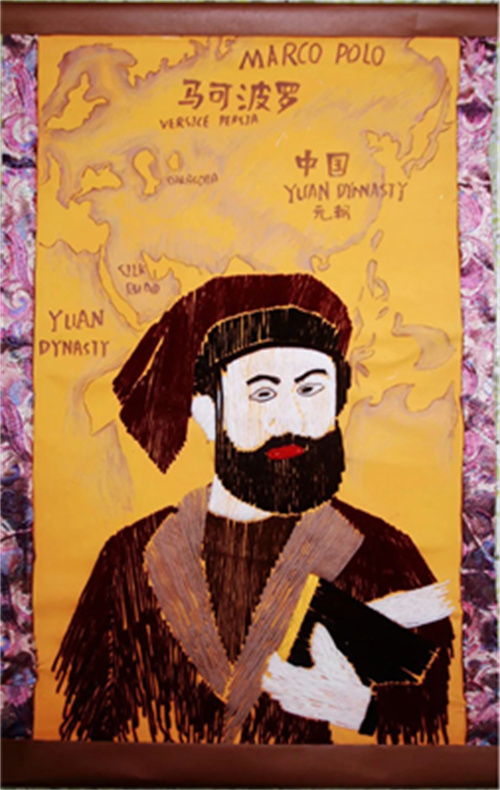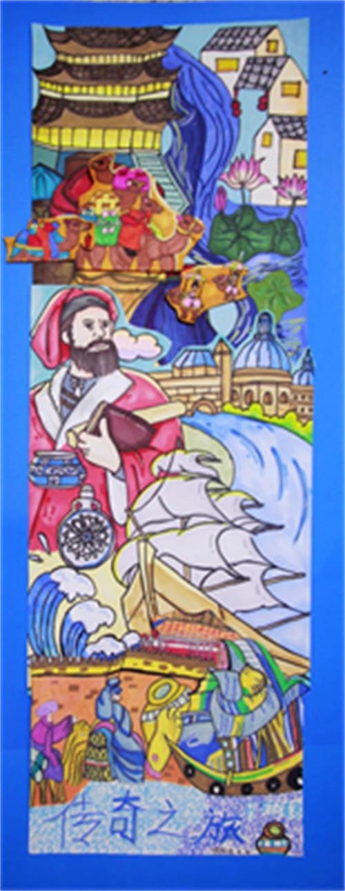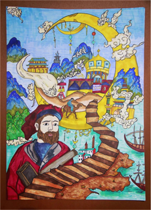根据《寰宇记》记载,东光孩子们发挥创意,选择画、绣等方式,运用多种综合材料来塑造这位大探险家的形象,展示这段闻名于世的传奇之旅。有用毛线绣像表现马可波罗的风采,边框再镶以蜀锦,凸显他和成都、丝绸之路千丝万缕的关系;有以马可波罗的视角去展示当年丝绸之路上的风土人情——从威尼斯到元大都,这一路山川异域,风月同天,宫殿气势恢宏,城市车水马龙,市井商铺林立,商旅络绎不绝;有复刻留存着中西文化交流痕迹的文物,充分展现了东西方文化通过丝绸之路传播的历史,如测量仪、罗盘,还有绝美的元青花等等,孩子们通过创作,走进了那段历史,走近了马可波罗,在艺术和历史的浸润中,在综合地创作中,充分培养了审美感知、艺术表现、创意实践、文化理解等核心素养。