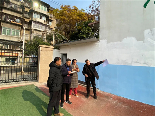 检查组对校园各类安全隐患进行排查,包括校园墙体、电动车棚等等。