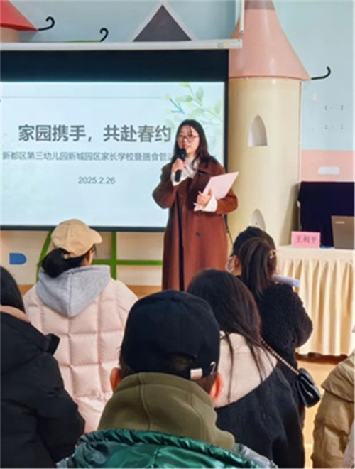 为进一步促进幼儿园与家庭的双向互动,切实加强家园联系,充分发挥膳食管理职责,全面提升幼儿园保教质量,2025年2月26日,成都市新都区第三幼儿园新城园区开展2025年春季学期家长学校暨膳食管理活动。
