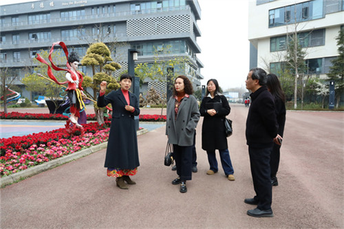 在学校党总支部委员、校长助理王素群的陪同下,潘珩副校长一行实地走访了学校航空文化主题园、动漫国际体验园、数字文创学院文化展厅、校园电视台、西餐文化体验园区、开放式校史馆、青阅书吧、好瓷胜玉陶瓷展厅、心理健康与生涯规划中心和虚拟仿真实训室等处。