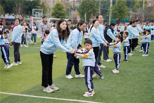 童年因游戏而快乐,生命因运动而精彩,在欢快的音乐声中,大小朋友们举起双手、尽情跳跃,积攒爱的能量。
