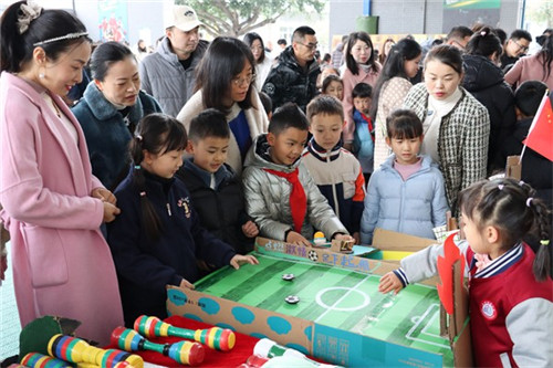 一个个展台前,同学们正细致地向家长们介绍他们的作品:从用废旧纸箱搭建的微型博物馆,到用废纸打造的精巧三星堆文物;从断枝残叶重构的美丽春景,到蛋壳里栽种的葳蕤生机;从由塑料瓶改造而来的花瓶、沙锤,到用废弃垃圾制作的缤纷运动器材……同学自豪地说:“我们想通过这个作品告诉大家,废旧物品也可以变废为宝,希望大家都能参与到环保行动中来。”
