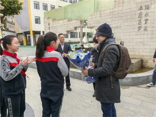 当萨拉萨尔先生一行踏入石笋街小学和雅校园,立刻受到师生们的热烈欢迎。学生代表手捧鲜花,表达对大师的敬意。