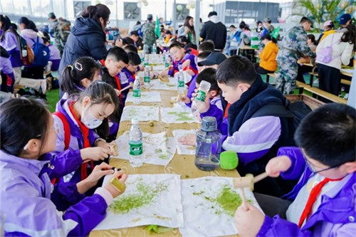 四至六年级的同学们置身于春意盎然的户外,开启叶拓创作之旅。他们将田间的树叶、菜花等摆放在白布上,挥动木锤有节奏地敲击。各种植物的汁液渗进布里,在素白布上晕染出春天独有的图案,将大自然的生机定格。