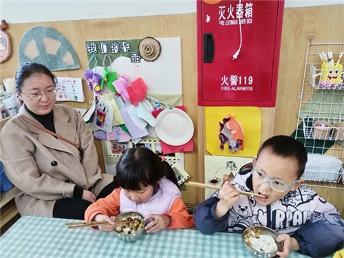 午餐时间,小朋友们有序排队盥洗,自主排队取餐,吃得津津有味。大朋友们在一旁耐心观察,深入、直观地了解幼儿在园的膳食情况。
