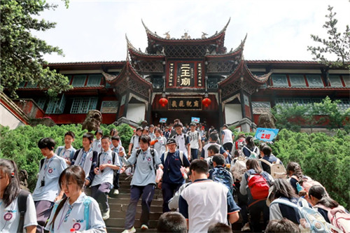 “用脚步丈量天府的春意,把诗情装进行囊”。首站抵达世界水利文化鼻祖——都江堰水利工程。站在江水奔腾的岸边,同学们跟随讲解员的脚步,近距离观察鱼嘴分水堤、飞沙堰溢洪道、宝瓶口引水口等核心工程。两千多年前古人“乘势利导、因时制宜”的治水智慧,在滔滔岷江水的映衬下熠熠生辉,让同学们深刻领略到天府文化“人与自然和谐共生”的深刻内涵。