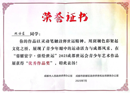 成都市新都区蜀龙学校龙佳译、陈倍萱两名同学,在来自全球多个国家和地区的近600幅青少年画作中脱颖而出,作品被新都发布报道,并作为获奖代表上台领奖。龙佳译同学作为获奖代表发言并受邀成都广播电视台专访。