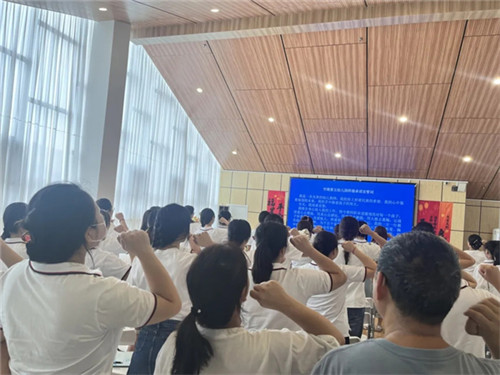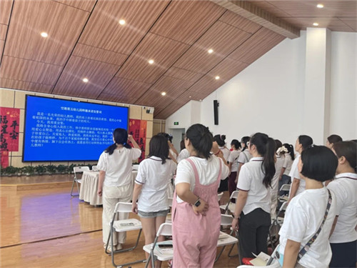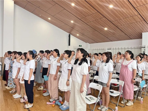 最后,全体教职工在章园长带领下宣誓:以2025年6月施行的《中华人民共和国学前教育法》为准则,恪守师德。尊重幼儿权利,优先保护安全健康,促全面发展,不违身心规律。科学保教不教小学课程,提素养、廉洁从教,不负信任,为学前教育优质发展助力,用爱与责任护童年。
