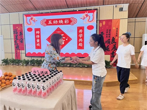 会前,会议室的桌子上早已摆满了暖心小惊喜:清爽冒泡的汽水藏着夏日活力,红彤彤的苹果寄寓“平平安安”,金灿灿的橘子寓意“大吉大利”,每样物件都满含园所对教职工的关怀。