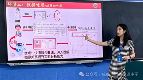 学校物理教师刘露带来《单摆法测量重力加速度》课例,运用“树德号”智能体,公开展示传统实验与AI技术的有机融合。课堂以“AI不是替代者,而是赋能者”为核心,构建“AI+传感器”双引擎教学模式。光电门、磁感应强度、微电流三类传感器与AI深度协同,贯穿“方案对比—原理探究—数据分析—图像绘制”全流程。特别设置的“AI vs 人工”对比环节,既让学生领略AI自动绘图与快速拟合的高效,也体会到人类在实验设计和批判性思维中的不可替代价值。