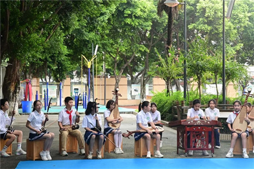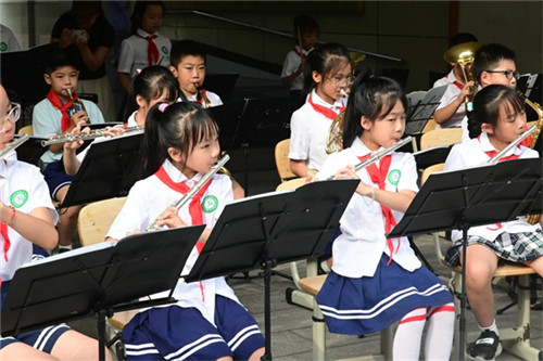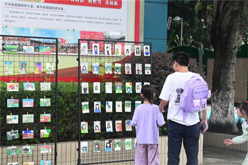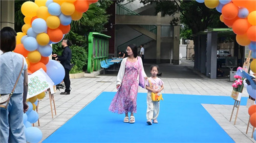 校内,管乐团和民乐团奏响激昂的迎宾曲,小乐手们精神抖擞,以铿锵乐声传递学校的热情与活力。道路两旁陈列着师生书画作品,一幅幅主题鲜明、笔触生动的书画,展现出学校浓厚的文化底蕴与丰硕的美育成果。学校全体行政人员齐聚气球拱门前,为每一位新生贴上特制的“阳光星宝”徽章贴纸,象征着孩子们正式成为新光小学温暖大家庭中的一员。
