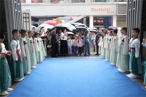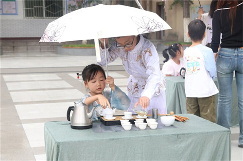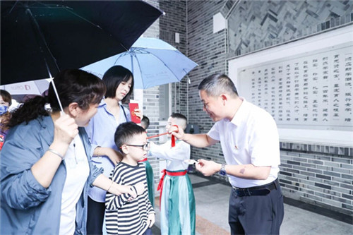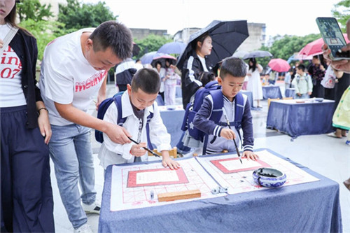 “朱砂一点红,点亮心中千盏灯。”学校行政轻轻执起朱砂笔,在孩子们的额头点上一点朱砂;随后,小萌新们神采奕奕地走过精心搭建的“启智门”,正式踏入知识的殿堂,开启人生的新篇章;执起毛笔,蘸满墨香,小萌新们在纸上缓缓书写着大大的“人”字;咚!咚!咚!一支鼓棒,一颗童心,敲响的是鸿鹄之志,传承的是千年礼俗。身着汉服的哥哥姐姐们手持茶具,烫杯、沏水……一股茶香扑面而来。以茶知礼节,懂感恩,优雅从容,让优良传统的种子在孩子们心中生根发芽!