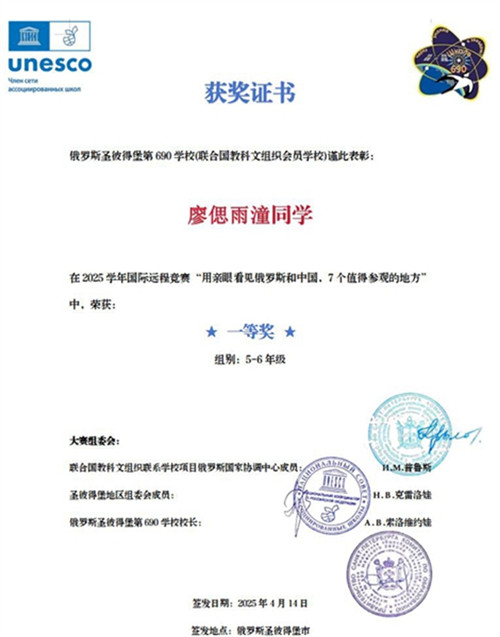 为庆祝世界旅游日,深化中俄文化交流,激发青少年对家乡文化的热爱与推介热情,“中俄世界旅游日——我的家乡最佳的文化旅游路线”演讲比赛于近日在俄罗斯圣彼得堡第690学校成功举办。本次比赛是由联合国教科文组织联系学校项目俄罗斯国家协调中心指导,联合国教科文组织会员学校主办,由中俄学生参与的线上比赛,比赛吸引了来自中国和俄罗斯多所中小学校的优秀学子积极参与,选手们用流利的英语,生动描绘了各自家乡独具魅力的文化旅游路线。最后由联合国教科文组织学校项目俄罗斯国家协调中心、圣彼得堡地区组委会以及俄罗斯圣彼得堡第690学校为获奖学生颁奖。