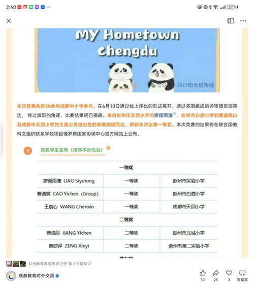 该活动不仅为同学们提供了一个展示语言能力、表达能力和对家乡文化理解的国际化平台,更有效地宣传了彭州市丰富的文化旅游资源,让“彭湃生活和立体山水城市”在国际舞台上展示独特的魅力,同时也增进了中俄青少年间的文化交流。(赖波)