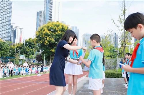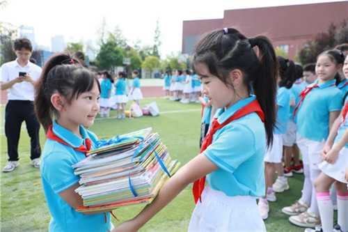 六年级同学从朱娅君的手中接过大队部赠予的图书,这是知识的力量,也是榜样的作用,更是爱的传承。