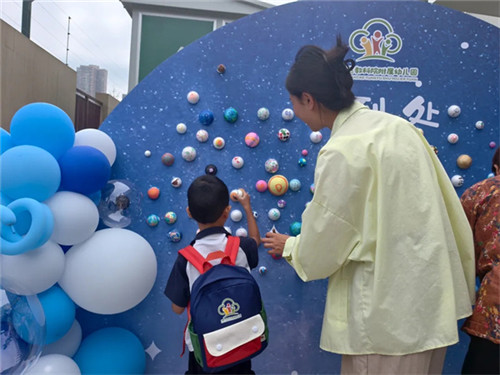 前期,家长与幼儿共同携手,利用胶泥、颜料等材料,打造出一个个色彩斑斓、造型独特的“星球”作品。开学第一天入园时,孩子们将亲手制作的“星球”粘贴在专属签到板上,用创意开启新学期第一步,并在开学打卡板处留下了自己最美的笑容。