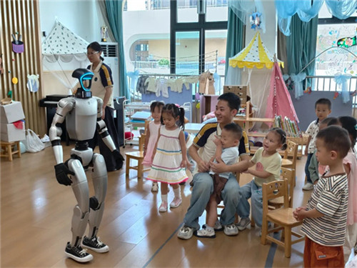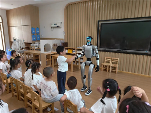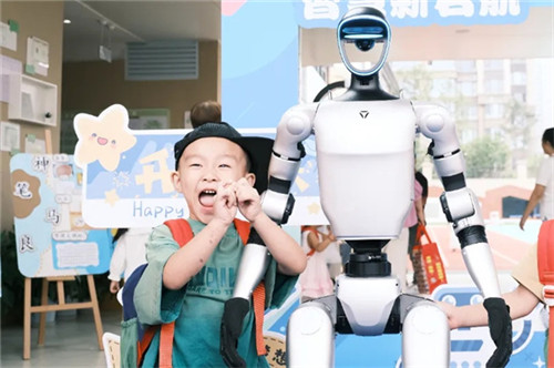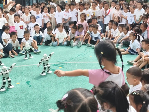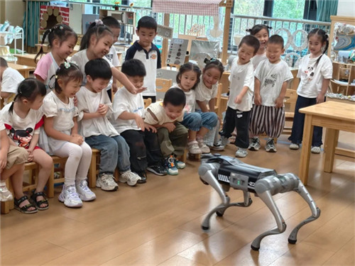 可爱的人形机器人和机器狗一出场便成为焦点,吸引着幼儿纷纷上前打招呼、互动玩耍。凭借灵动的动作和亲切的互动,它们瞬间拉近了与孩子们的距离,成功点燃了大家的开学热情。